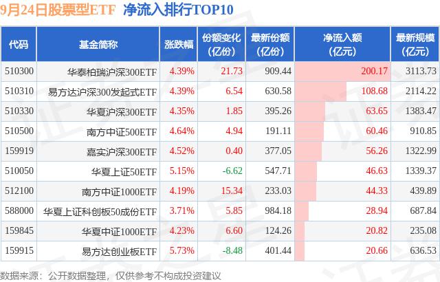 当天有 806 只股票型 ETF 资金净流入为基金,其中华泰柏瑞沪深圳净流入排名第一。 增加了300ETF(510300)的份额 21.73 十亿份,净流入额为 200.17 亿元。