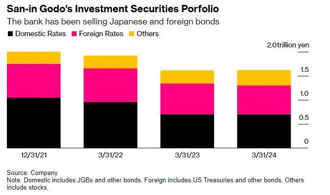山阴合同银行正在寻求在2027年3月之前,将其证券持有量重新调整到2万亿日元,这是从4月份开始实施的三年运营计划。近几年来,由于该公司亏本出售美国国债和其他债券,自2021年以来,其投资证券投资组合已经缩水20%,截至3月份约为1.6万亿日元。