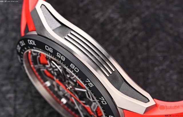第一,表头结构更加复杂、高级。全新卡莱拉 Extreme Sport 手表采用多结构的表头结构,与同一系列其他卡莱拉手表完全不同。它由一个内部框架和两侧的桶形部件组成,与表耳完美融合,具有一体化结构的设计感,完成了材料的无缝结合。为突出其赛车竞速魅力,从跑车进气格栅的设计中启发了两侧部件,将表面设计成凹槽,并经过黑色。 PVD 镀层细粒面处理,视觉上极具力量感,线条饱满强烈,有张有弛,仿佛蕴含着无尽的冲击力。