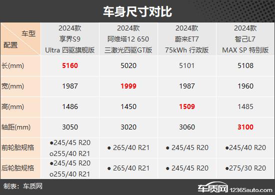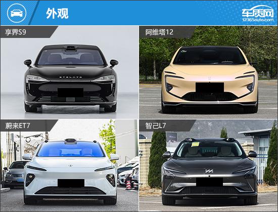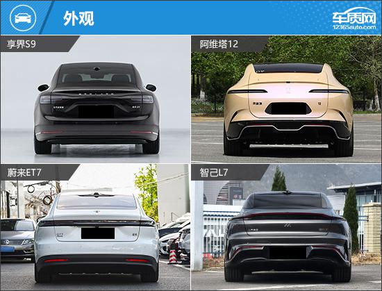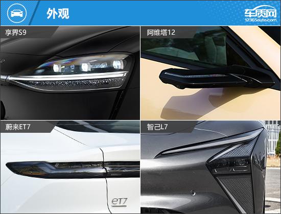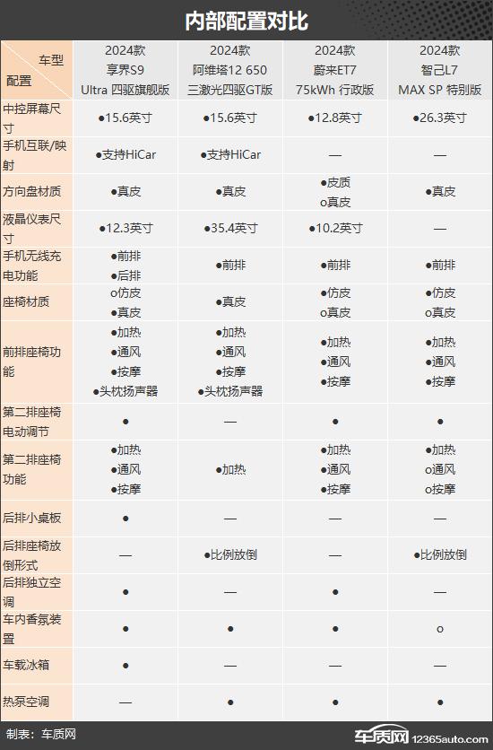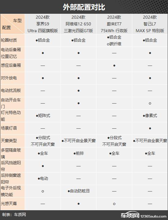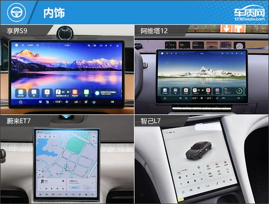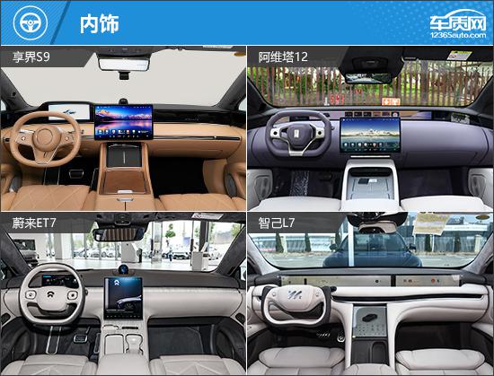 外观设备部分,享界 S9 和智己 L7 推广实用主义,前者的亮点是多了后挡风遮阳帘和电动后侧窗遮阳帘,舒适性和私密性能更好。阿维塔 12 很多装备对年轻人来说都可以称之为“暴击”,如电动尾翼、自动开关门、电子外后视镜等,非常花哨炫酷。相比之下,蔚来 ET7 除可以选择碳纤维材料的轮毂和光泽天慕外,整体表现十分平淡,与其他三款竞品车型相比没有优势。