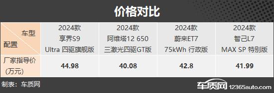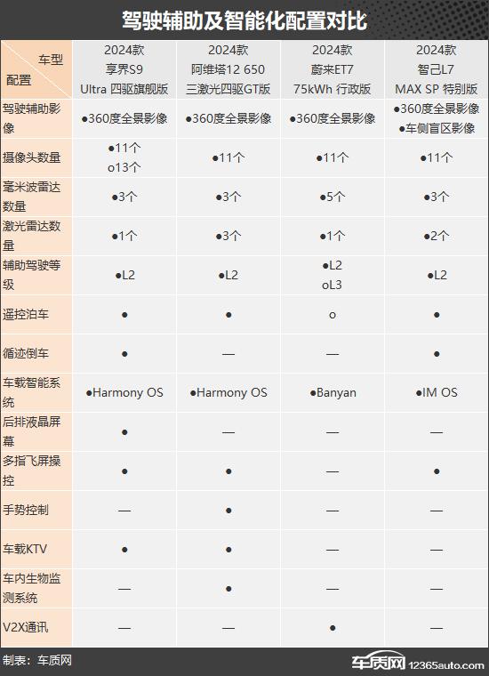 在智能配置方面,阿维塔 12 专属手势控制和车内生物监测系统,可玩性强。另外,享界 S9 还颇具亮点,配备后排液晶屏,常指飞屏操作,车载 KTV。相比之下,蔚来 ET7 和智己 L7 这个部分的表现确实比较逊色。