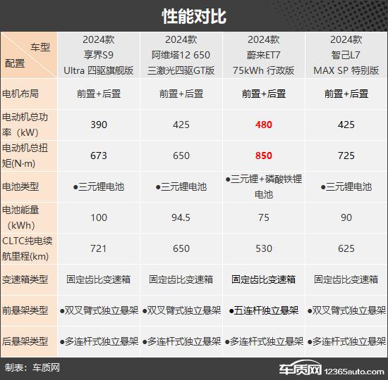 动力方面,四款车都搭载前 / 后双电机驱动系统,其中最引人注目的参数是蔚来。 电动机总功率ET7 总扭距480kW 850N · m。然而,俗话说,鱼和熊掌不能兼得,蔚来。 ET7 的 CLTC 只有纯电续航里程 在这次比较中,530km排名垫底。虽然也算不上“续航焦虑”,但与竞争产品相比,往往是一种“续航焦虑” 600km 甚至 700km 续航里程,当然还是要逊色一些。