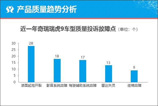根据车质网的数据,奇瑞瑞虎 9 最近一年的投诉主要集中在“漆面起泡开裂”上。考虑到瑞虎 8L 全自研旗舰 SUV,制造工艺肯定会有所进步,所以可以暂时认为出现上述问题的概率很低。但是具体情况如何,需要一段时间才能得出结论。