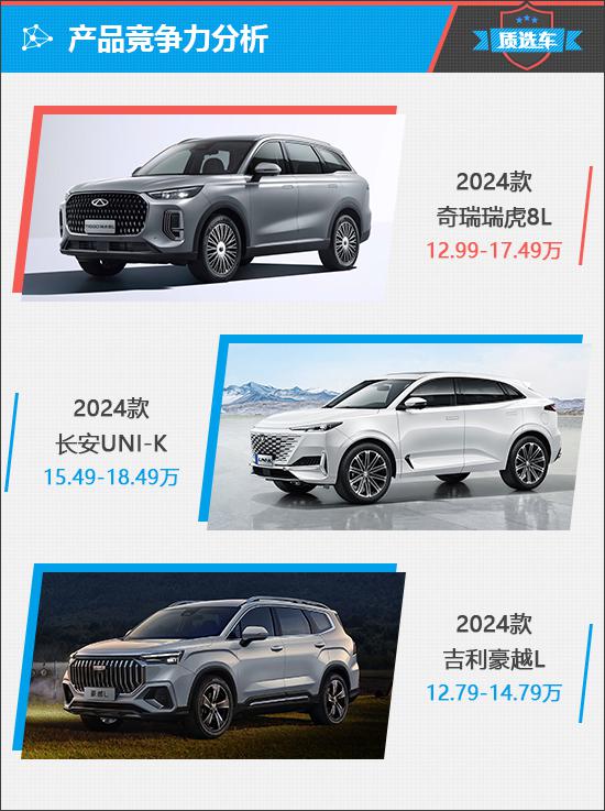 就价格区间而言,奇瑞虎 8L 起步价和最高价都在吉利豪越。 L 和长安 UNI-K 中间。吉利豪越的起步价最低。 L,顶级车型价格最高的就是长安。 UNI-K,已超过了 18 万元。就车型数量而言,奇瑞瑞虎 8L 提供了 5 这款车,同样位于另外两款车型之间,不过其中两款高配车型支持选择第三排座椅,更具替代性。