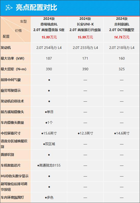 就设备而言,我们选择了尽可能相似的车型。值得注意的是,由于定价原因,吉利豪越来越多 L 是整个系统的顶级车型。从配置对比中不难看出,奇瑞虎 8L 无论是在安全配置方面,还是在目前客户关注的智能汽车系统方面,配置性能都相当出色,配置水平明显与其他两款车型拉开了距离。从动力参数来看,虽然三款车型都配备了 2.0T 涡轮增压发动机,但是奇瑞瑞虎 8L 其整体性能要好于其他两款车型,特别是在发动机最大功率方面,领先优势明显。