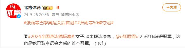 全国游泳锦标赛50米蝶泳决赛:张雨霏25秒16夺冠 第一个冠军是巴黎奥运会之后