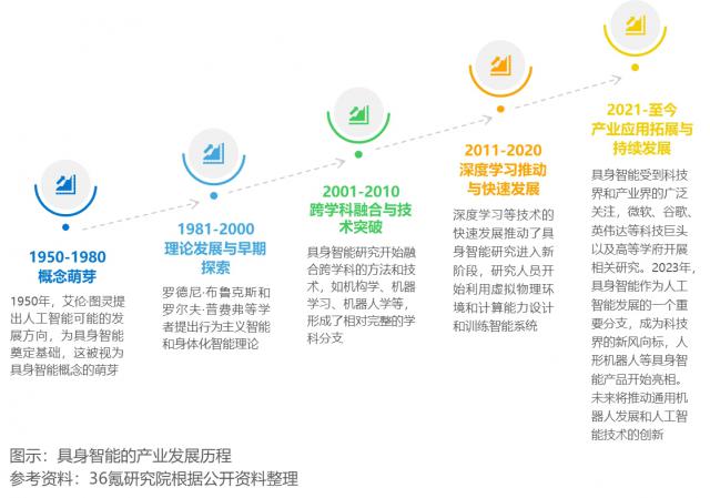 具有智力的产业发展经历了多个阶段,自我发展 1950 在时代图灵提出人工智能可能发展的趋势为其概念奠定基础之后,1980 至 1990 罗德尼经历了最初的探索和理论发展。 · 布鲁克斯和罗尔夫 · 普费弗等研究为研究提供了重要的理论支持。2000 20世纪初,结合跨学科方法和技术,具身智能研究开始进入跨学科融合和技术突破阶段。近几年来,具身智能受到广泛关注,并逐步走向工业应用。
