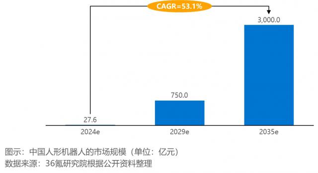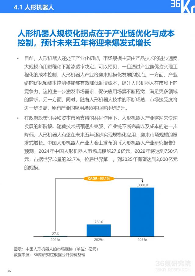 在工业应用中,人形机器人取得了显著进展,在生产、新能源、医疗等多个应用领域的需求不断增加。许多企业已经发布了人形机器人产品或迭代版本,并取得了技术突破。但是现在仍然面临着大规模的挑战,这主要是由于技术难度大,制造成本高,商业化难度大。业内预测,随着技术瓶颈的克服、产业链的完善和成本的降低,人形机器人市场有望快速增长,2035年 预计中国的市场规模将达到年度 3,000 亿元。