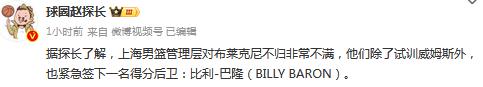 据记者赵探长介绍,上海男篮管理层对布莱克尼不归非常不满。除了试训威姆斯,他们还紧急签下了一名得分后卫:比利 - 巴隆。