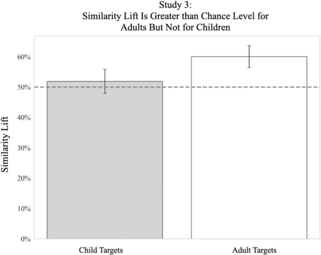 结果发现,成年人有相同的名字,相似度达到60.05 %,明显高于50%的随机概率 。相比之下,有相同名字的孩子并没有表现出相似之处(51.88%)。