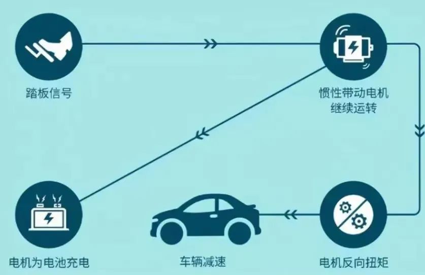 这是因为这类汽车在抬起加速踏板后,电机会利用电磁感应原理,将车轮上的动能转换成电能再次充入电池, 使车辆同时减速。