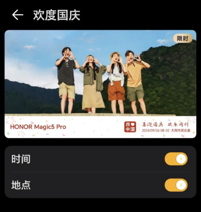 IT 世家得知,这款荣耀手机共同上架" 75 周年国庆"、两个限时水印“欢度国庆”,在水印中可以配备拍摄时间,拍摄位置,但是相机快门、焦段、焦段都没有收录,ISO 等数据。