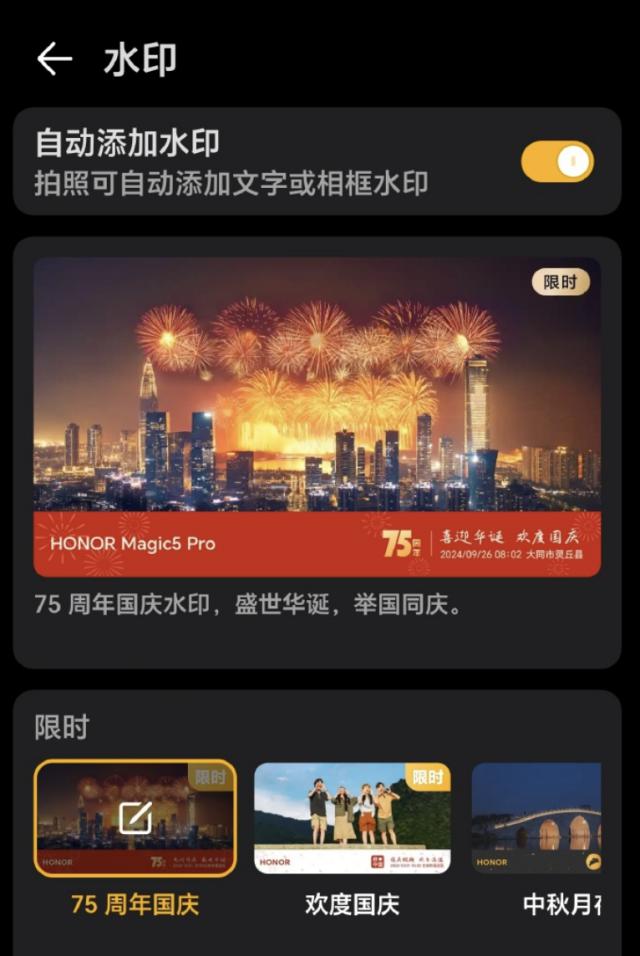 IT 世家 9 月 26 每日新闻,荣耀手机现已上线 75 周年国庆限时相机水印,拥有相应品牌手机的用户可在相机上使用。 App 在设定中找到水印选项,并打开“自动添加水印”功能,欢迎各位朋友在圈内分享含水印的国庆照片。