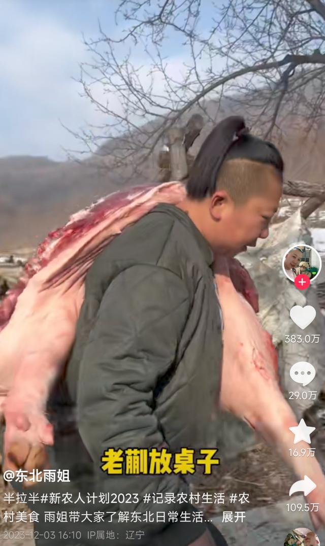 扛半猪,盖猪舍,挑大柴。 …… 东北雨姐在短视频中开辟了一条新的赛道,赢得了大量粉丝,因为她做事匆匆忙忙,浑身是劲,声音中气十足,背景音乐节奏感十足。