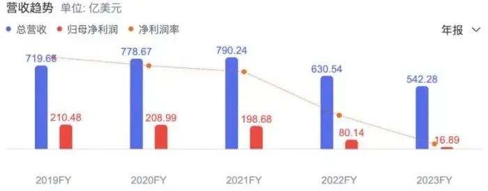 自2021年以来,英特尔的衰落开始显现。起初,该公司的年收入接近800亿美元,随后以每年100亿美元的速度急剧下降。2023年,英特尔的年收入跌破600亿美元,营收大幅下降三分之一。