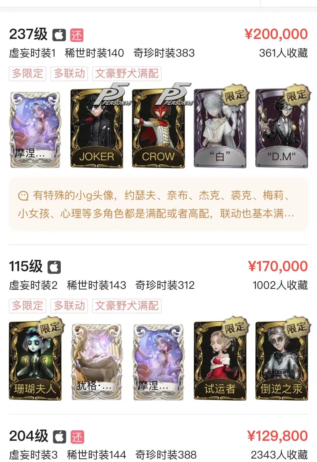 豪仔说《第五人格》的账号值钱不值钱就看皮肤了,不同于《蛋仔》的背刺玩家每隔一段时间修复一次。《第五》的限制是真实和有限的,即使复制周期很长,数字上的稀有物品越多,价格也能卖得越高。