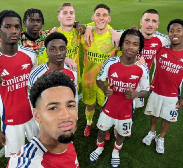 比赛结束后,阿森纳青训队员聚集在酋长球场的草坪上,拍了一张集体照片。照片中,9 面对镜头,一位年轻人面带微笑,脸上挂着对未来的美好期待。