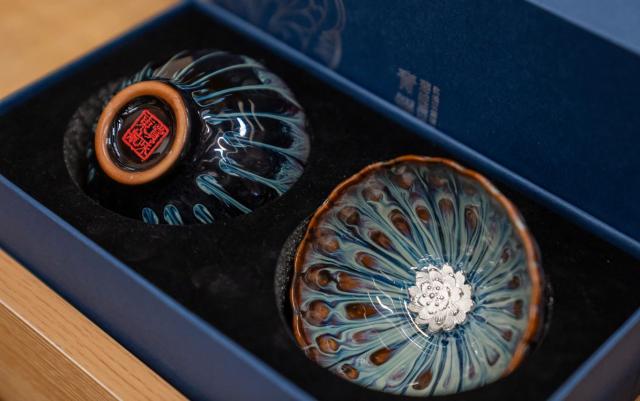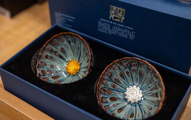 天成的莲杯,伴随着饮料,这款双杯选用莫高窟第一 428 孔雀荷花人字披纹样,金银相对,绚丽多彩。
