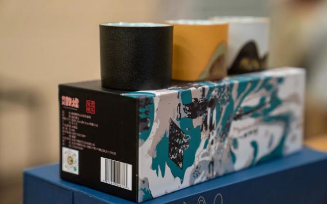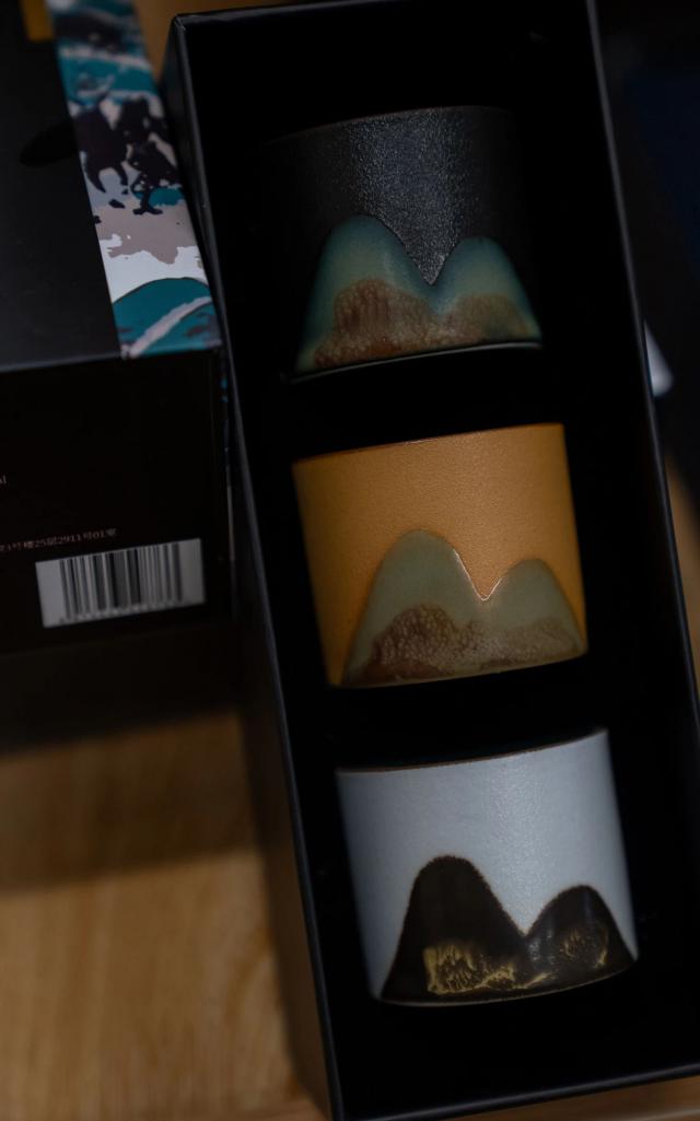 这个图案来源于唐代莫高窟。 217 洞穴壁画《佛顶尊胜陀罗尼经》 · 序言。杯子吸收壁画中的黑、白、土黄三种颜色作为杯子的颜色,表现出不同的意境,图案以山峰为主,再现壁画的叠染技巧。这个文化创作也是本次展览及东航赏味推出的联合文化创意产品。