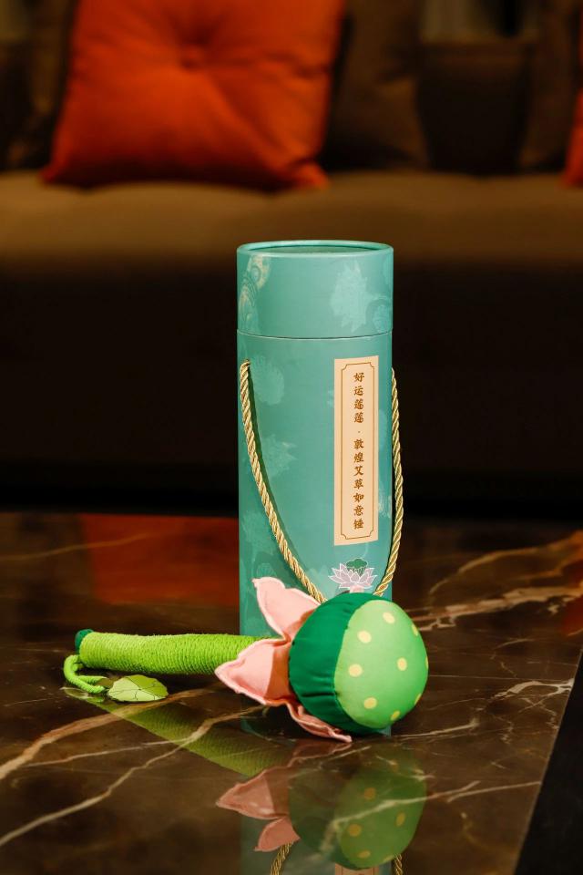 宝莲福盈在握,好运莲莲自来,金刚交杵守护,捶绵寿健康。此时此刻,菩萨在壁画中持有的宝莲变成了手中实用的养生如意莲锤,在草本的香味下,锤子消除了疲劳。