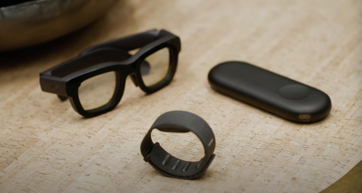 Meta的解决方案也很巧妙,因为AR天生就有重量限制。Orion分为三个部分——眼镜本身、分立式计算设备和与运动手环大小相同的腕带。