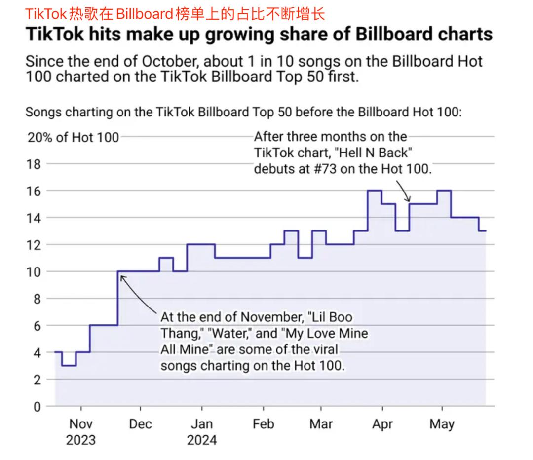 根据Collabstr在线名人营销平台上发布的数据,从2023年9月到2024年5月,TikTok热歌在Billboard 在Hot100排行榜上,份额不断上升,目前保持在16%左右的水平。