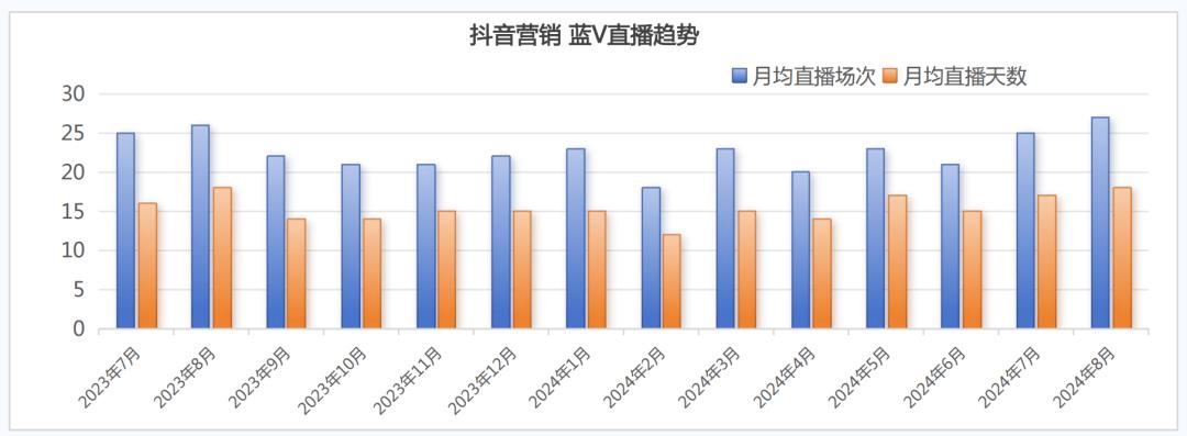 根据统计,目前房地产企业所有账户的月平均直播场次20 ,平均每月直播天数15 ,根据市场数据,每个蓝V账号平均每天有1.5场直播。直播时间在一年内从80分钟增加到90分钟左右。