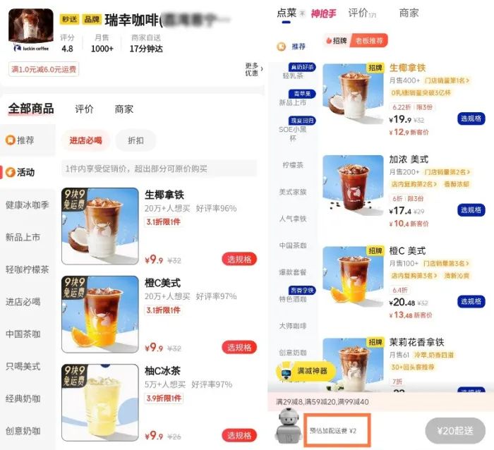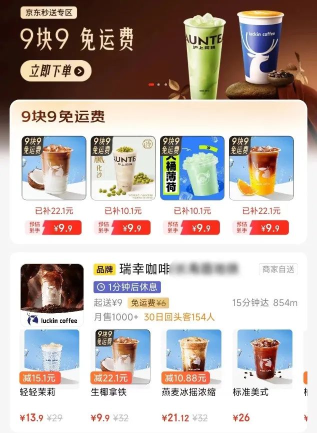 目前,在咖啡奶茶区的顶端,9.9免费运费的瑞幸、上海阿姨,以banner和独立卡的形式,在区首页占据了很大的比例。