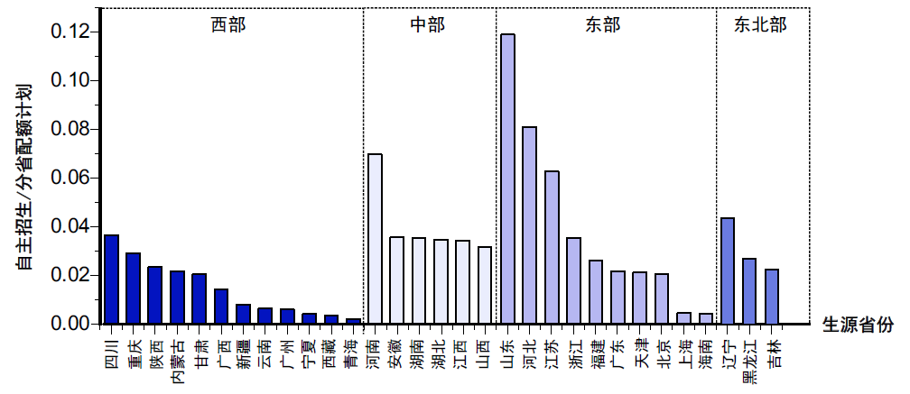 在中部地区,河南省学生通过自主招生获得录取的几率相对较高,体现了这一地区考生在自主招生中的竞争优势。另一方面,在西部地区,自主招生的整体录取率非常低,这可能与这些地区自主招生政策的推广有限有关,也与国家在省份配额中对西部地区的政策倾斜有关。