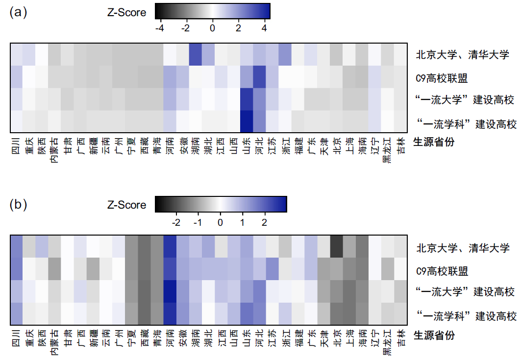 图3:各省学生流向不同排名大学的热图。.(a)自主招生, (b)省级配额计划