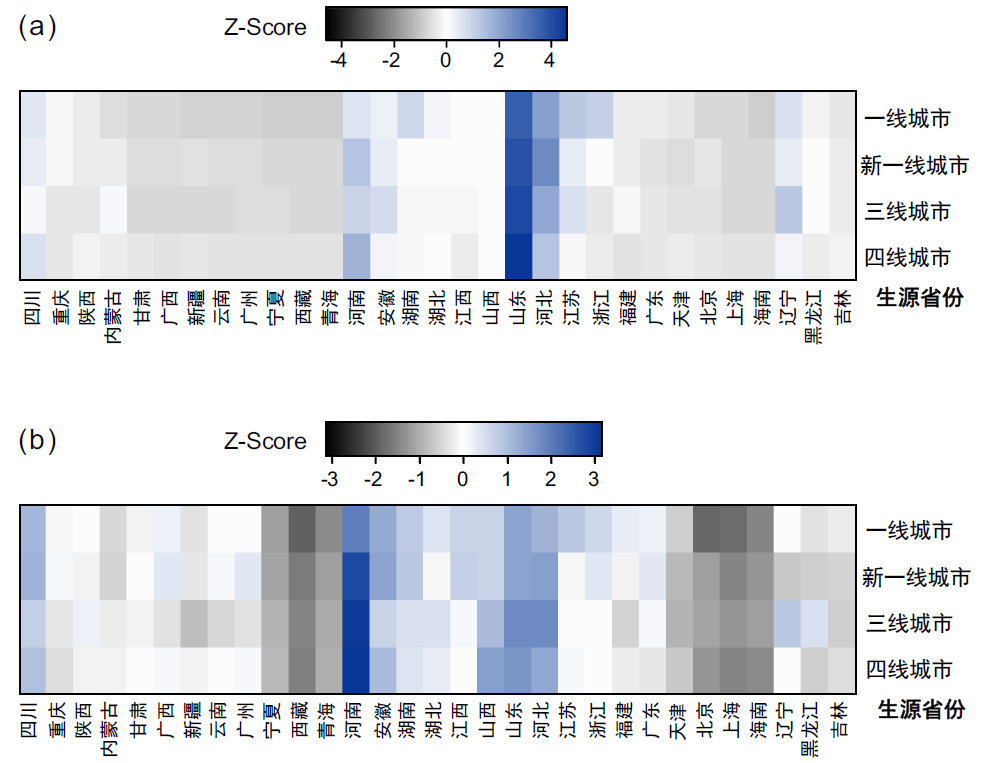 图4:各省学生流向不同等级城市的热图。.(a)自主招生, (b)省级配额计划