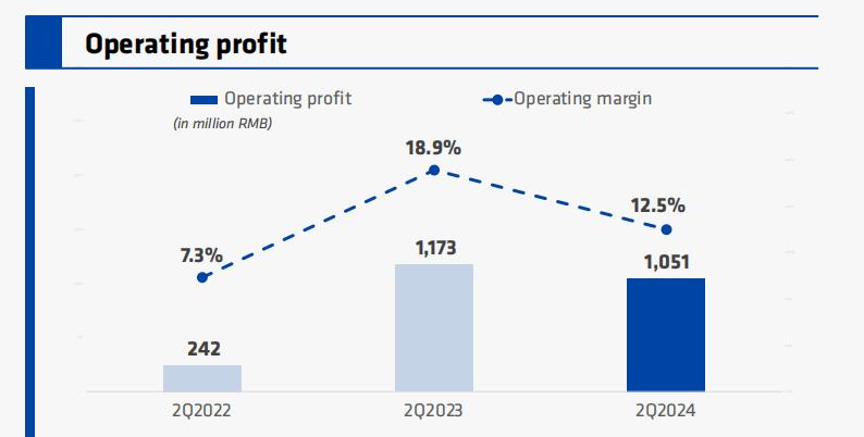 不过我们发现,与稳定增长的营收相比,瑞幸的营业利润却呈现出较大的波动。最大差值(2024年Q1与2023年Q2)可达到12.38亿,最新两季度营业利润差距也达到了11亿之多。