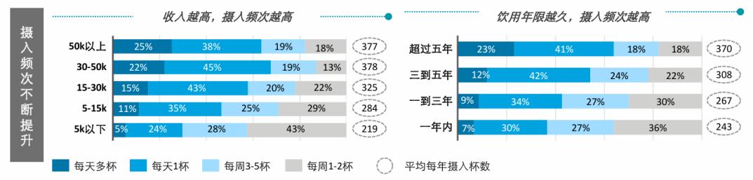 一是,得益于咖啡的成瘾性、心理依赖等,对于已经养成喝咖啡习惯的消费者来说,超过50%的人群会不断增加咖啡摄入频次——从低频用户发展成高频用户,提升咖啡消耗量。