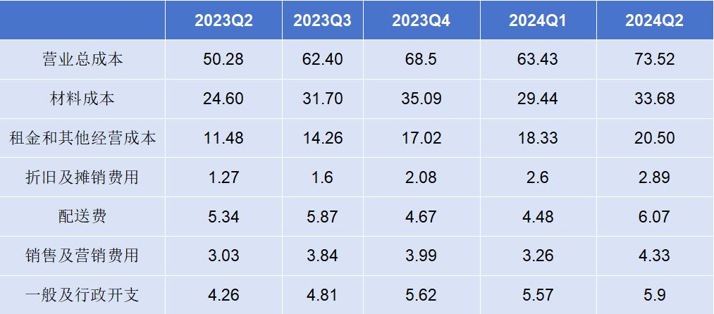 除杯量问题之外,瑞幸CFO安静在财报分析会还指出:「2024年Q2营业成本占营收比例增长,主要是由于店铺租金和其他营业支出以及材料成本占净销售额比例增加所致,因为公司的产品平均销售价格下降。」