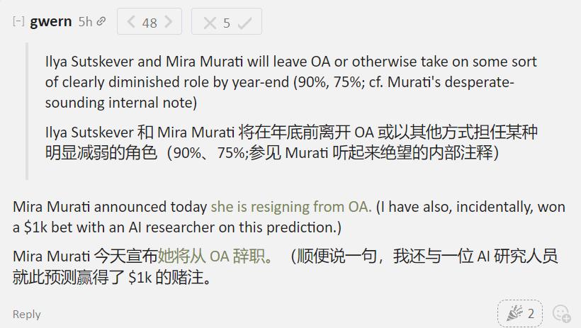 现在,Mira正式宣布辞职,这种猜测再次得到验证。这位网友还表示,他和一位AI研究人员预测,他获得了1k美元的筹码。