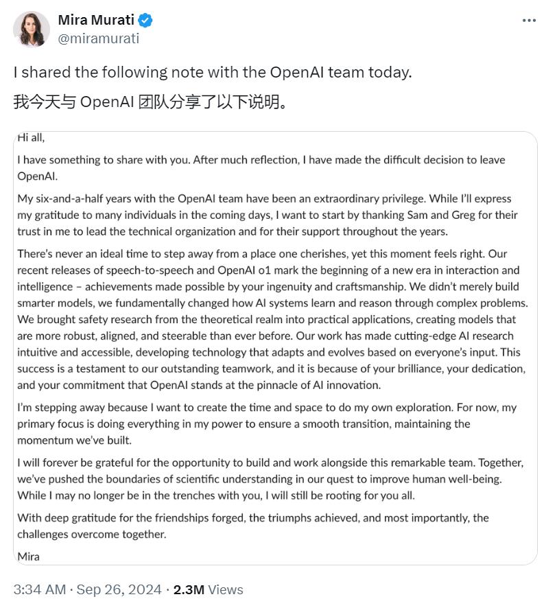 Mira在离职推文中写道:“告别你珍惜的区域,从来没有合适的时间。“但这一刻感觉是对的。最近发布的语音转换语音技术和OpenAI o1意味着互动和智能新时代的开始。