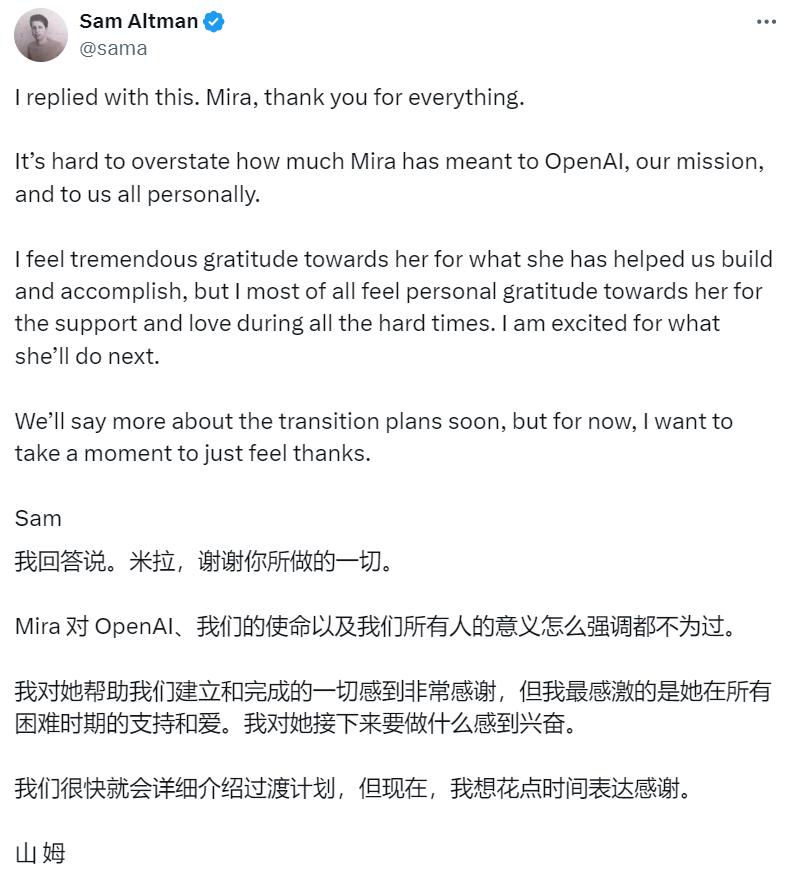 Sam Altman体面的感谢词如期而至,他感谢Mira对OpenAI的贡献,并表示“过渡计划很快就会详细介绍”。