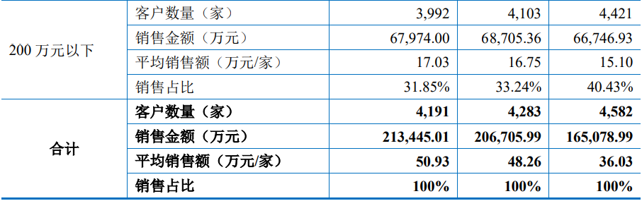 与此同时,昆仑联通的客户数量也在逐年减少。从2021年到2023年,公司客户数量分别为4582家、4283家和4191家,其中客户数量主要在200万元以下。