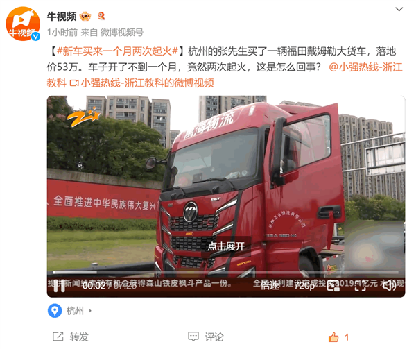 九月二十六日,据报道,张先生于七月三十日购买了一辆福田戴姆勒牵引车,落地价格53万元,结果只运行到8月28日,不到一个月,车辆在同一位置发生两次火灾,他们都不敢开车。