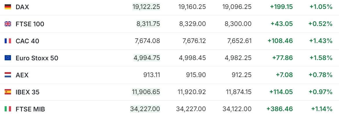 刚刚开盘的欧洲市场也处于欢腾状态,欧洲斯托克50指数上涨近1.5%,德国DAX指数和法国CAC40指数上涨超过1%。路易·威登集团与中国消费市场密切相关(LVMH)开盘跳涨超过4%、保时捷上涨超过2%。