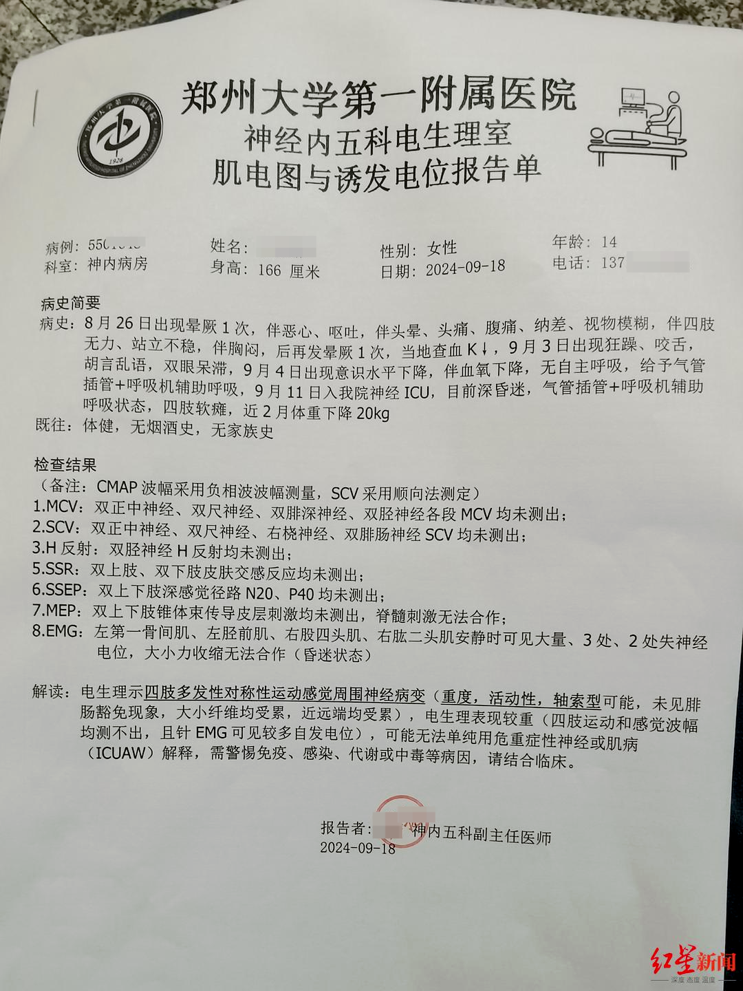 二十五日,小王的爸爸告诉记者,目前她的闺女还没有恢复意识,也没有脱离危险期,需要继续住在重症监护室。根据小王爸爸提供的一份检查报告,9月4日,小王的观念水平下降,伴随着血氧下降,没有独立呼吸;9月11日,小王进入郑州大学第一附属医院神经ICU;至报告日(9月18日)持续深度昏迷,四肢瘫痪,两个月内体重下降20KG。