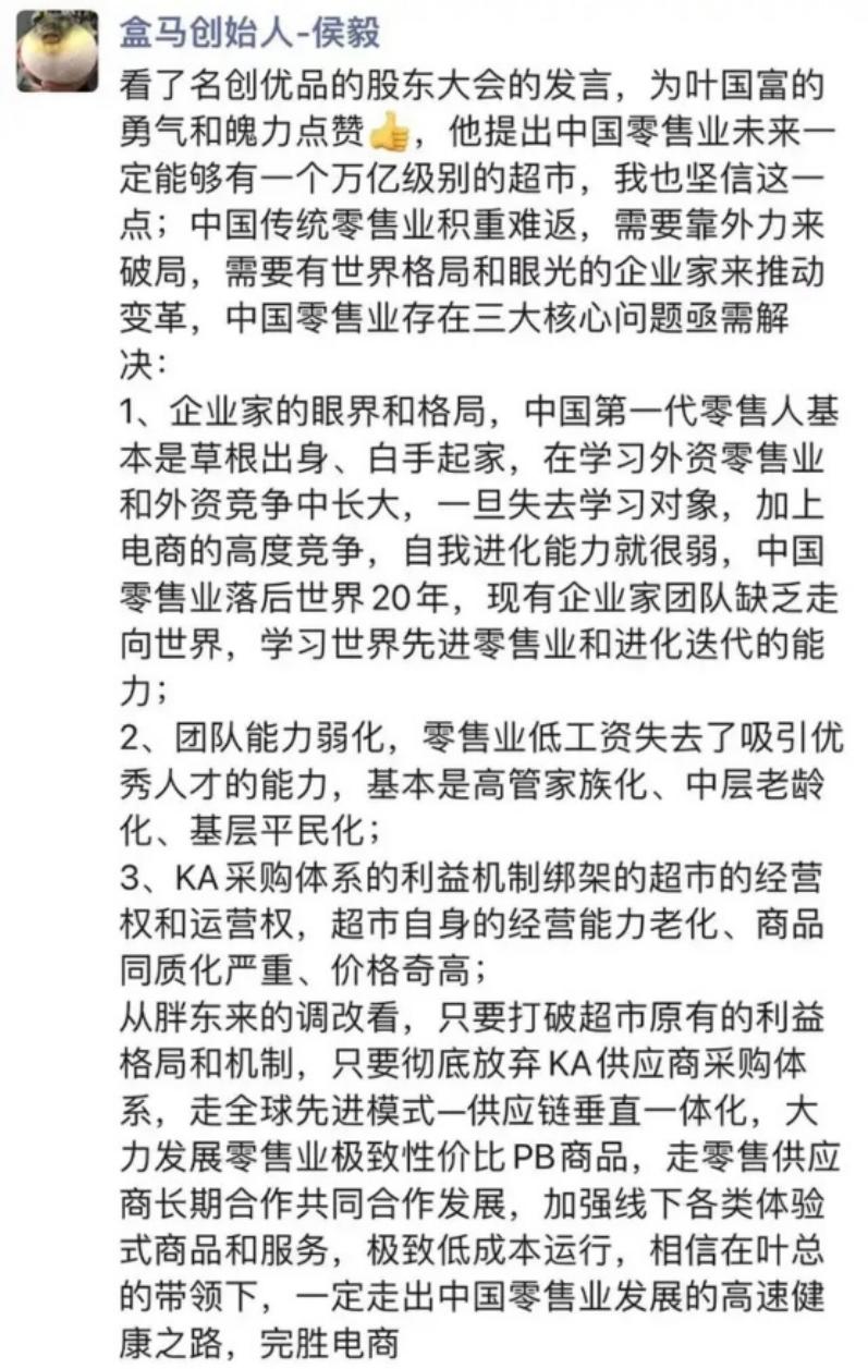 因此,侯毅也支持从永辉超市购买名优产品。他认为中国传统零售业很难回归,需要依靠外力来打破游戏,需要有世界格局和眼光的企业家来促进变革。