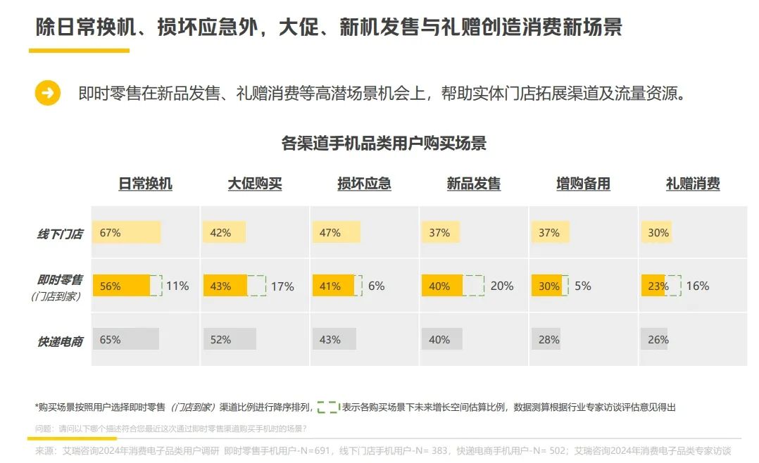 第三阶段是2020年以来,随着信息传播速度的加快和消费观念的改变,消费者通常希望在看到自己喜欢的手机产品后尽快开始。即时零售平台,如美团闪购、京东秒送等,满足了消费者对时效的需求,成为消费电子产品销售的新蓝海。