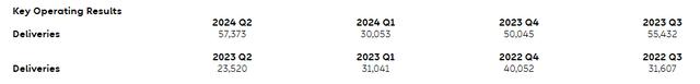 24年第二季度,蔚来汽车交付了57,373辆电动汽车,去年交付了23,520辆电动汽车。这种增长是因为蔚来更新了其电动汽车阵容:该公司交付的57%是SUV,而汽车交付量仅为43%。