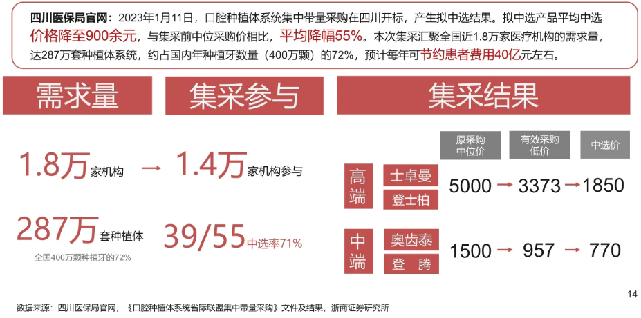 集采购前价格较高的士卓曼、登士柏、诺保科种植系统,从原采购中价格约5000元,降至1850元;奥齿泰、登腾种植系统,市场需求最大,从原采购中价格约1500元,降至770元。