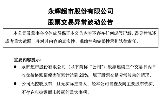 永辉超市发布股票交易异常波动公告