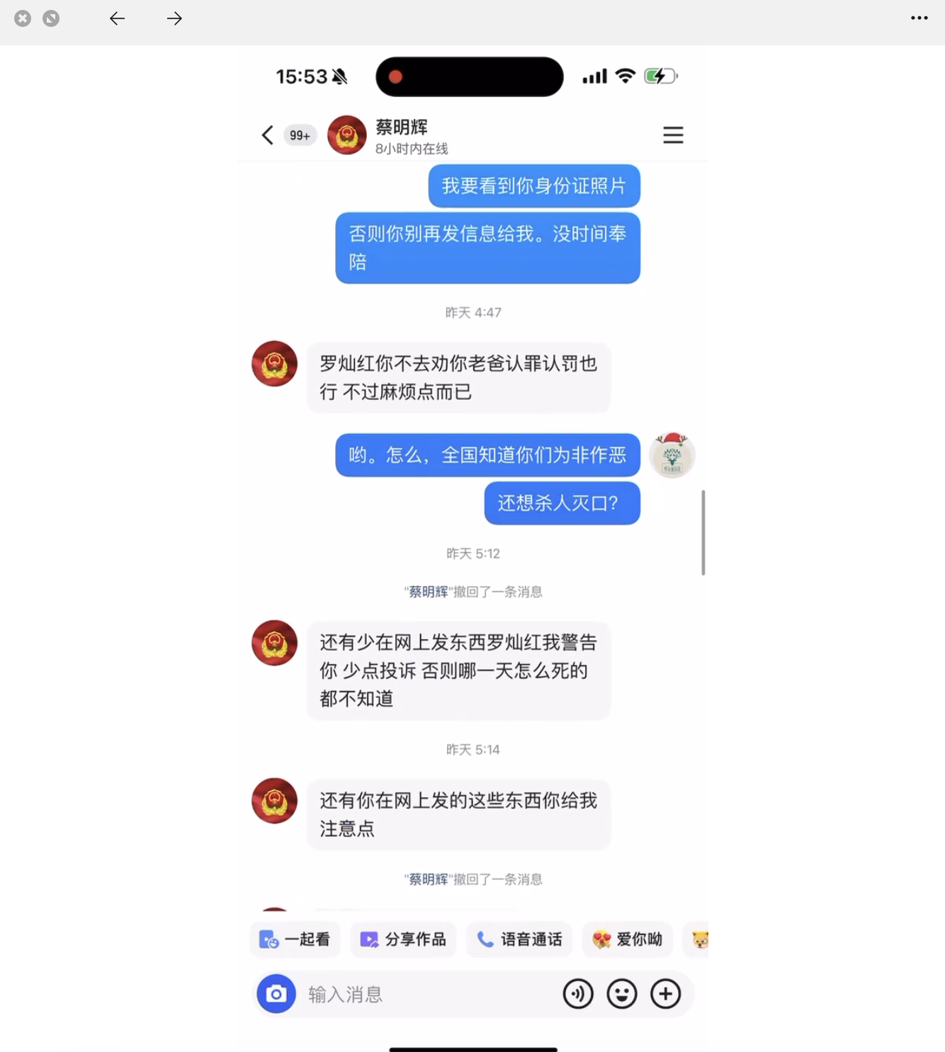 然而,一周前,9月19日凌晨,罗灿宏在一个社交平台上收到了一位名叫“蔡明辉”的网友的私聊。对方警告罗灿宏少在网上发消息,少抱怨,“不然我不知道有一天我会怎么死”。此外,他建议罗灿宏传达他父亲的认罪和惩罚,这样他就可以少受点罪。