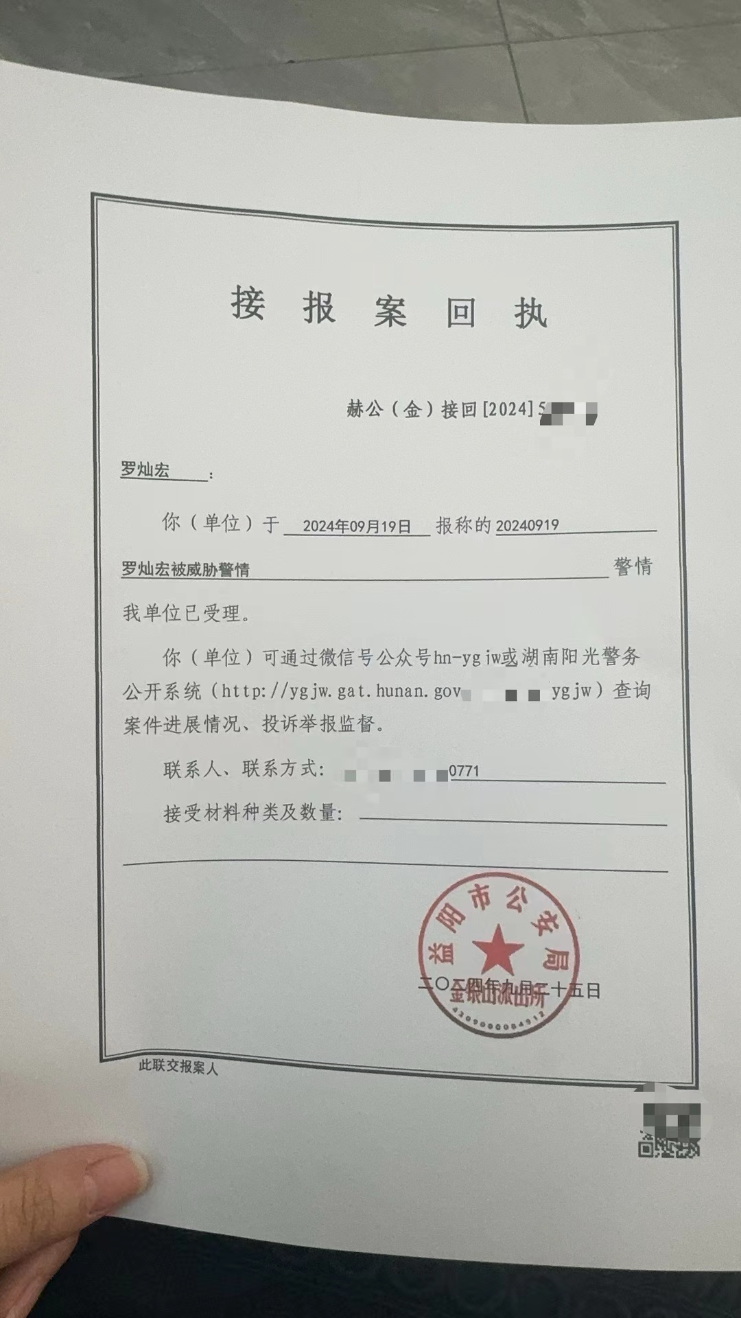 9月19日下午,罗灿宏报警受到言语威胁。9月26日,罗灿宏所在地区的金银山派出所发布了一份报告收据,显示该单位已受理上述案件。