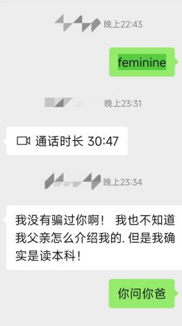 她立刻响起警钟,漫不经心地说:“你是本科生吗?”。得到肯定的回答后,芹芹半开玩笑地问:那你可以给我看毕业证。男朋友吞吞吐吐地说“不”,表现出孩子犯错被大人训话的样子,解释说学分已经修好了。因为在国外被抢,父母担心他们的安全,没有拿到毕业证。