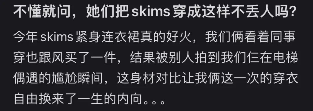 一些冲动买Skims回家的顾客消极悲观——什么样的身材配得上这些裙子?裙子虽然贴肤度很高,但对身体曲线的需求也很高。除了常年保持“魔鬼身材”的超模肯豆,大多数普通人很难有喜人的上半身效果。